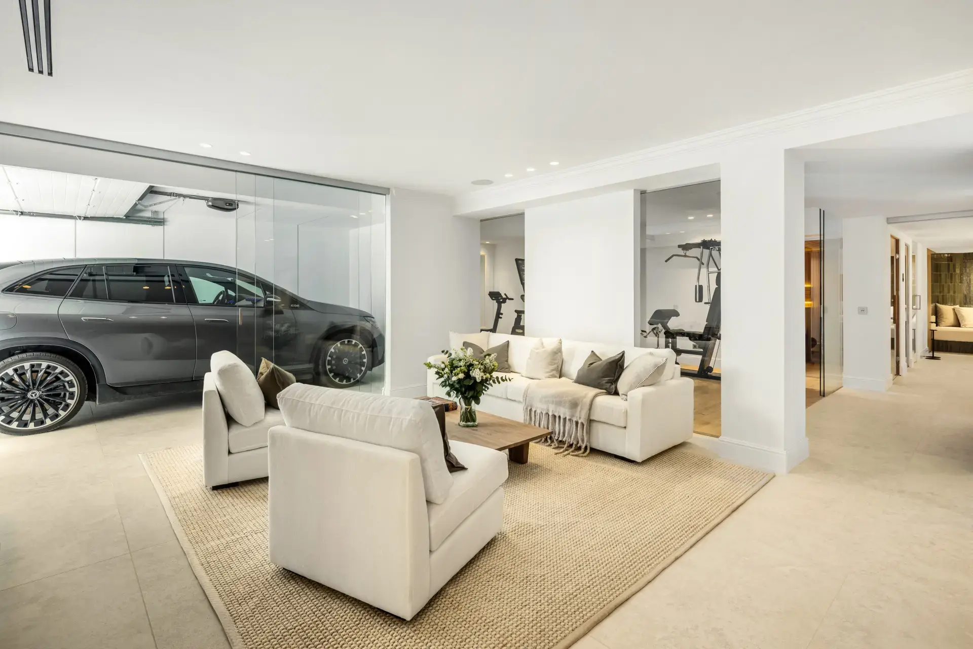 Inside, natural light floods the open-plan interiors, where high ceilings and soft neutral tones create an atmosphere of refined tranquility. The villa features several lounges, a designer kitchen, a private cinema, wine cellar, gym, and spa. Each of the five bedrooms offers en-suite bathrooms and private terraces or garden access — perfect for relaxation and privacy.